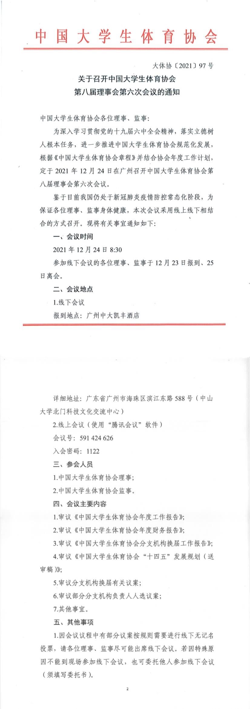 关于召开中国大学生体育协会第八届理事会第六次会议的通知