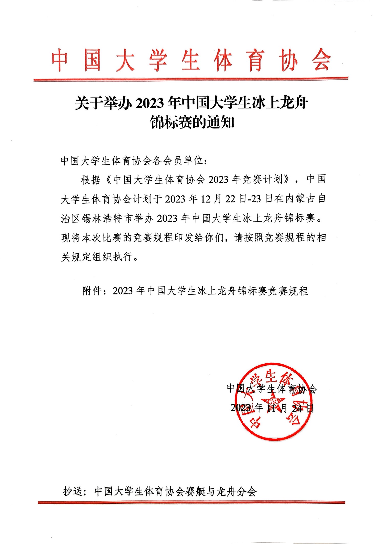 关于举办2023年中国大学生冰上龙舟锦标赛的通知
