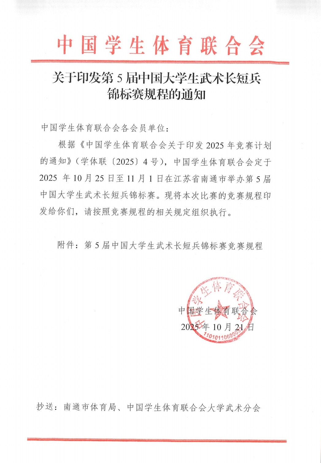 关于印发第5届中国大学生武术长短兵锦标赛规程的通知