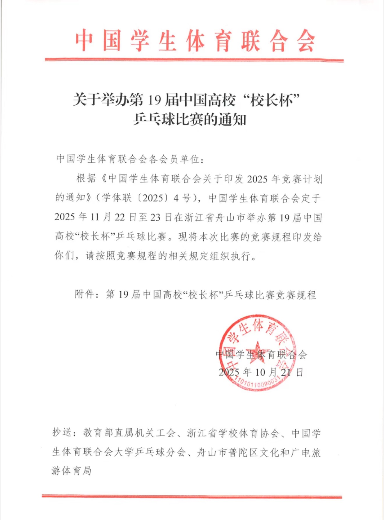 关于举办第19届中国高校"校长杯"乒乓球比赛的通知